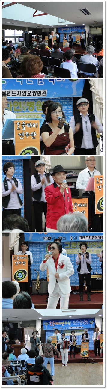 지난 12월 5일 그랜드자연요양병원을 찾은 한울타리 연주단은 가수 최명운의 추억의 소야곡, 청산유수를 시작으로 가수 서용의 빈손, 가수 한송이의 저강은 알고있다 등 흥겨운 옛가요를 비롯하여 색소폰의 합주로 어르신들과 함께 할 수 있는 흥겨운 시간을 마렸했다. 가수 임대윤의 아코디언 연주와 함께하는 추억의 시간은 늘 어르신들의 어깨를 들썩이게 한다.