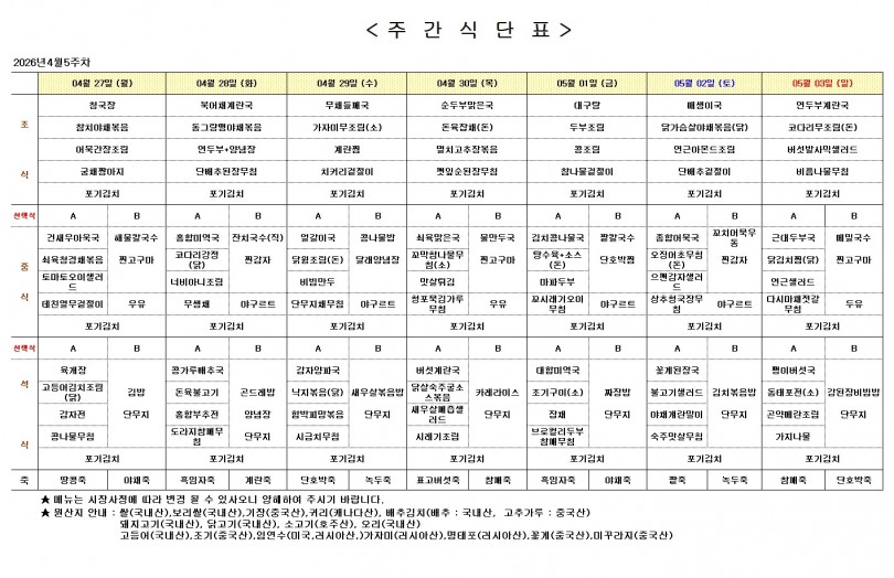 주간 식단표 (4월 5주) 페이지 정보 작성자 최고관리자 작성일26-04-24 09:47 조회43회 댓글0건 다음글 목록 본문 주간 식단표 (4월 5주) 댓글목록 등록된 댓글이 없습니다. 다음글 목록