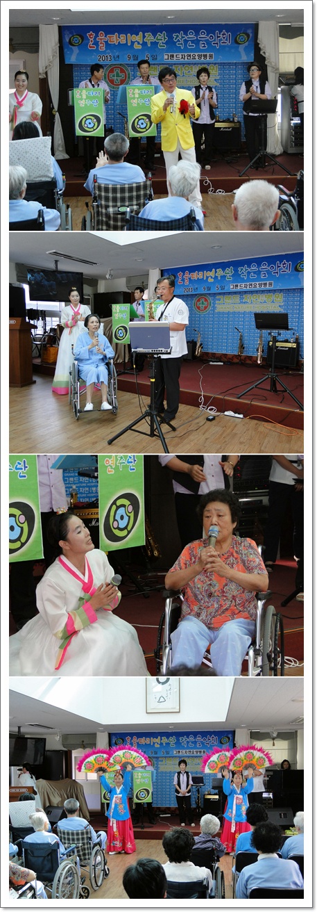 지난 9월 5일 한울타리 연주단의 공연에는 가수 오래의 첫차를 시작으로 가수 최명운, 이정민을 비롯해 최기자 무용단의 부채춤등 어르신들이 좋아하는 다양한 무대가 펼쳐졌다. 특히, 나용승 병원장의 색소폰 반주에 부른 환우들의 노래와 직원들의 노래 참여는 하나되는 그랜드의 힘을 보여 주는듯 했다.