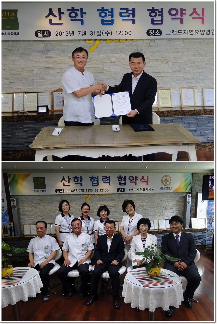 지난 7월 31일 그랜드자연요양병원(병원장 나용승)은 큰 생각, 큰 사람, 큰 대학을 추구하는 국제화 선도대학 신라대학교 체육학과와 산학 협력 협약식을 가졌다. 그랜드자연요양병원 나용승 병원장은 신라대학교와 함께 정보교환, 인적교류, 물적교류 등에 관한 상호 교류를 활발히 추진하고 상호 협력을 통해 지역 발전에 기여할 수 있는 좋은 만남이 되었으면 한다고 강조하였다. 이에 신라대학교 이중숙 교수는 보다 적극적인 소통을 통해 노인 운동 프로그램등 활발한 교류가 만들어 졌으면 한다고 말했다. 이날 참석자로 병원측에서는 나용승 병원장, 김용철 부원장, 석송숙 간호부장, 홍순애 원무과장, 유인주 행정과장, 이지영 기획홍보팀장이 대학측에서는 이중숙 교수, 양정옥 교수, 이범진 교수가 각각 참석하였다.