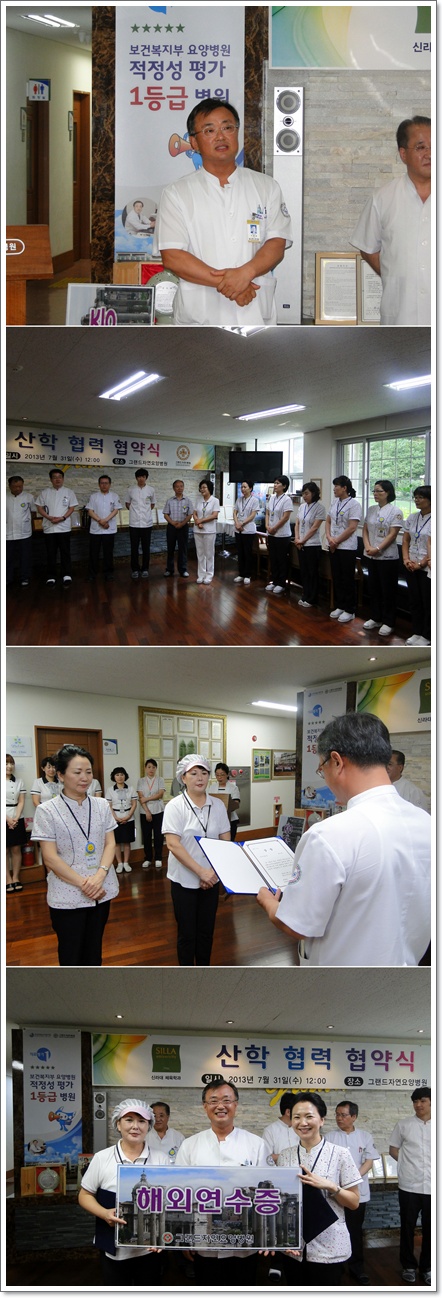지난 8월 1일 본원은 1층 로비에서 전직원들이 참석한 가운데 그랜드 자연 월례회를 가졌다. 나용승 병원장은 더운 날씨에 어르신들의 건강 관리에 만전을 기하자는 말씀을 하셨다. 이어서 2013년도 하반기 우수직원에 대한 시상이 이어졌다. 수상자는 영양과 최미애 조리사, 간병과 2병동 류귀숙 주임이며, 11월에 해외여행을 계획하고 있다.