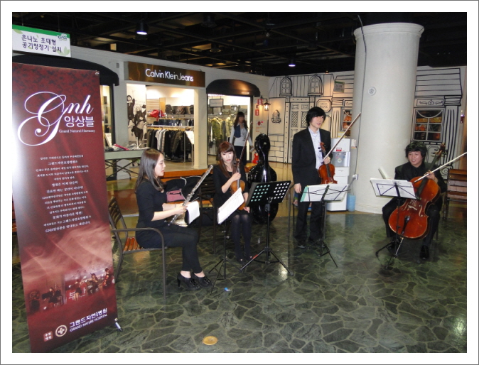 그랜드자연요양병원 GNH앙상블은 지난 11.26일 세번째 찾아가는 토요공감 무대를 오후시간 메가마트 용호점에서 클래식과Movie & Drama OST 모음곡을 연주하여 마트를 찾은 지역주민들에게 초겨울의 운치를 수놓은 좋은 선율을 선사하였다. -일시:2011.11.26(토)16:00-16:40 -장소:메가마트 용호점 [단원소개] 풀루트 신현이(에코 플루트 콰이어 수석) 바이올린1st 김혜진(창원시립교향악단) 바이올린2nd 나혜경(뉴프라임오케스트라 단원) 비올라 성정인(크로스팬던트 단원) 첼로 조선일(부산심포니오케스트라 단원) 악장 박세운(박세운 치과의원장) 단장 나용승(그랜드자연요양병원장)