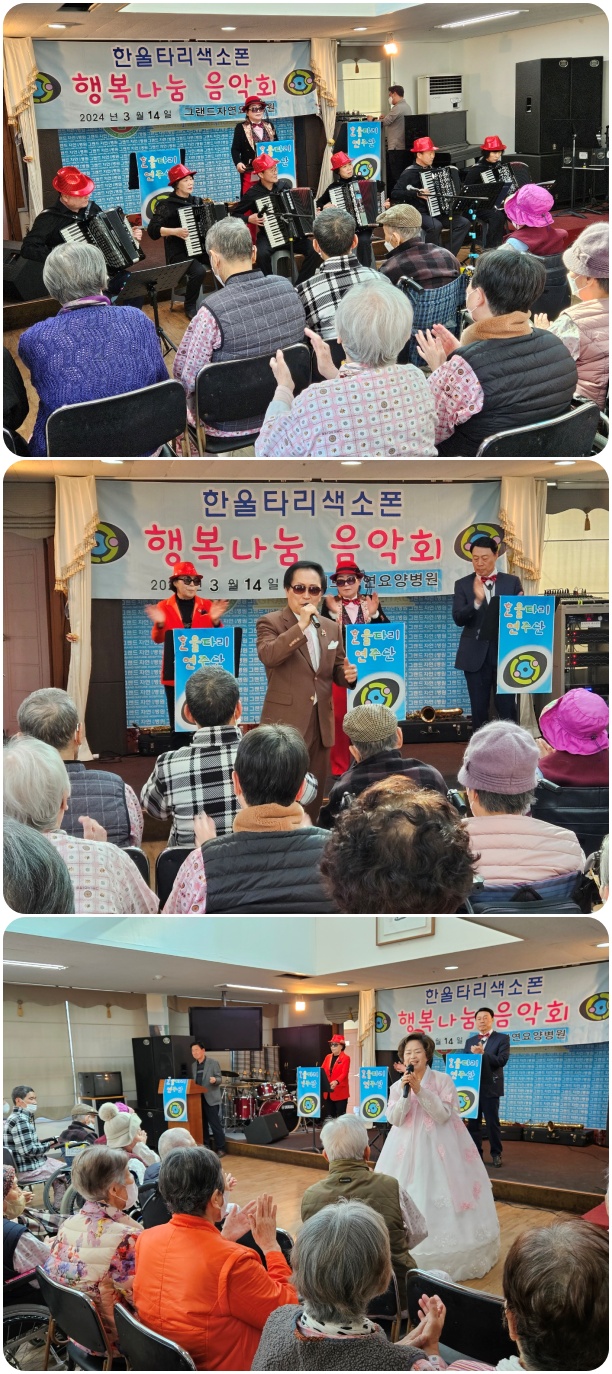 그랜드자연요양병원은 3월 14일 한울타리 색소폰의 <행복 나눔>공연으로 작은 음악회를 열었다. 이날 공연은 아코디언 합주로 <얼굴>, <섬마을 선생님> 등을 선보이며 <부산 갈매기>등의 색소폰 연주로 어르신들과 함께 흥겨운 시간을 마련했다.