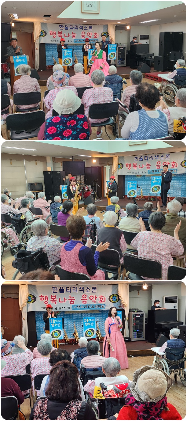 그랜드자연요양병원은 4월 11일 한울타리 색소폰의 <행복 나눔>공연으로 작은 음악회를 열었다. 이날 공연은 찔레꽃, 물새우는 강 언덕 등의 색소폰 연주와 창부타령, 해운데 엘레지 등의 옛가요로 어르신들과 함께 즐거운 시간을 마련했다.