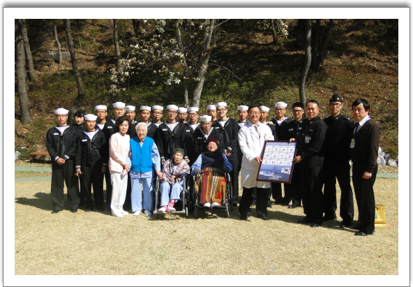 지난 4.12일 세종대왕함 장병 20여명이 내원하여 자원봉사활동을 펼쳤다. 이날 장병들은 2개조로 나뉘어져 먼저 재활치료센터에서 유인주 팀장의 지도로 휠체어 사용에 따른 안전교육을 받고 휠체어 봉사활동을 펼쳤다.또다른 조는 산책로와 등산로 보수작업등 환자분들의 안전에 관련되는 노력봉사 활동도 함께 펼쳤다.장병들은 어르신들과의 짧은 시간이지만 함께한 "나눔의 여운"을 가지고 귀대했다. [봉사활동 현장]