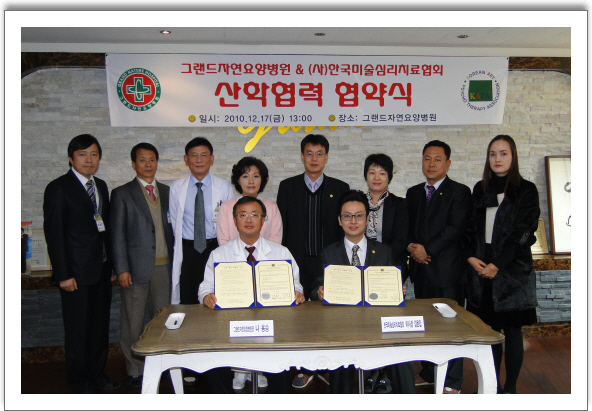 그랜드자연요양병원은 지난 12.17일 (사)한국미술심리치료협회와 산학협력 협약식을 가졌다.이날 협약식 참석자는 그랜드자연요양병원 나용승 병원장,손신 진료부장,박순찬 행정부장,이성준 기획조정실장,오미송 간호과장과 협회측에서는 김문갑 이사장,정종철 본부장,박현성 대외사업지원단장과 연구원3명이 참석하였다. 나용승 병원장은 현재 매주 화요일 환우들에게 미술 심리치료를 행하고 있는 협회의 임원진들과 더욱 유대감과 실질적인 업무 조율이 가능한 협약식을 가지게 된것이 병원에 큰 연말 선물 갔다며 축사에 대신하였고,김문갑 이사장은 부산남구지역의 좋은 병원에서 양질의 미술심리치료를 통해 환자들에게 다가갈수 있는 시설과 환경을 갖춘 그랜드자연요양병원과의 만남은 연말을 보내면서 또 한 번 좋은 일이라며 축사에 대신하였다. *그랜드자연요양병원은 12주 프로그램으로 진행된 미술심리치료에 참여한 환우들이 만든 작품전시회를 오는 12.24일부터 2층 문화홀에서 가질 예정이다. [행사 스케치] 협약서 서명