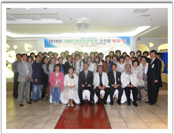 지난 10.6일까지 본원은 전직원을 대상으로 2회에 결쳐 워크-샵을 가졌다.이 번 워크-샵은 직원들의 업무역량 향상을 위해 필수 사항 위주로 교육 프로그램이 편성되었다.감염예방을 위해 동아대학교의료원 감염내과 정동식교수의 초청강의 이어서 가진 친절강의 프로그램은 김민드레강사가,마지막 인성교육 강의로 박순국님의 "당신이 바껴야 한다."는 주제로 열띤 강의가 워크-샵 행사장을 가득 채웠다. 참석자들은 마지막으로 분임토의의 시간을 가지고 병원생활에서의 친절,주인의식,참여도 증진방안등에 대한 각조별 발표가 이어졌다. 워크샵을 통한 전직원 업무역량 강화는 변화하는 요양병원의 움직임에 보다 적극적인 방법으로 대처하는 청량제로 작용 할 것이다.