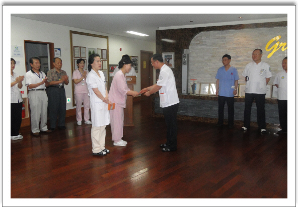 지난 8.2일 본원에서는 8월정기월례회를 가졌다.이날 월례회에서 나용승 병원장은 휴가철 안전교육과 혹서기 환자들에게 미칠 수 있는 각종 안전사고에 대해여 강조하였고 모범자가차량 운전자에 대한 시상식도 병행하여 실시하였다. 본원은 현재 전직원차량에 대해 고객만족 서비스의 질 향상을 위한 일환으로 차량5부제를 도입 원활한 주차관리가 되도록 강구중이다. 수상자:최성미,김말희,박정미,이영순,최선임,서진숙(6명)
