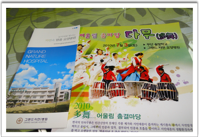 새앎춤회(회장 남선주)는 오는7.3일 그랜드자연요양병원을 찾아 7월의 첫주말시간을 보내는 환우와 직원들에게 어울림 춤마당 다무(多舞)를 통한 문화봉사 활동을 펼친다.남회장은 "병상에 있는 환우들에게 엑티브한 율동을 통한 만남은 새로운 활력소가 될 수 있다며 이 번 공연은 인근지역주민에게도 공연장은 열려 있으며 바다와 태양의 땅 부산에서 살아가는 우리 모두에게 자기 발견의 계기를 제공하려 한다며 춤을 통한 봉사활동에 의미를 부여하였다. [공연일정] -일시:2010.7.3(토)14:00 -장소:그랜드자연요양병원 문화홀 -단체:새앎춤회(경성대학교)