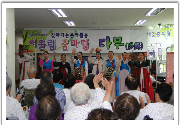 지난 7.10(토)그랜드자연요양병원에서는 새앎춤회의 어울림 춤결마당 다무(多舞)공연이 열렸다.민속무용은 어떠한 격식이나 일정한 법도가 필요치 않고 서민들의 정서와 소박한 감정을 적나라하게 표출한다는 데에 중점을 두고 기존의 민속무용을 재구성하여 관객의 대상에 맞추어 흥겹고 신명나는 춤으로 만들어 전문 무용수들 뿐만 아니라 소외된 계층들도 함께 참여할수 있도록 유도하여 함께 우리춤을 체험해보는 어울림 춤판의 물결을 일으켜보자고 다무(多舞) 즉,우리모두의 춤이 만들어 졌다고 남선주 회장은 전하였다.이날 공연 연출에 남선주 기획에 구지혜,이남정 출연에 하선주,남선주,구지혜,김옥희,송윤경,이남정,박소영,김여운 그리고 사회에는 손지연씨가 수고해 주었다. 무대는 태평무,산조춤,초립동,장고춤,부채춤 그리고 모듬북과 진도북춤의 어울림마당으로 이어졌다.환우들과 직원들은 흥겨운 토요일 오후를 보내며 주말을 한때를 문화와 함께 보냈다. [후원/지원:부산문화재단] [촬영:그랜드자연요양병원 기획조정실 영상지원팀]