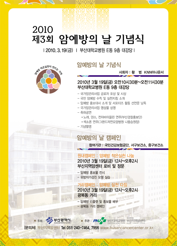 2010년 제 3회 암 예방의날 기념식 페이지 정보 작성자 그랜드자연병원 작성일10-03-20 14:54 조회2,757회 댓글0건 이전글 다음글 목록 본문 2010년 제 3회 암 예방의날 기념식포스터 입니다. 댓글목록 등록된 댓글이 없습니다. 이전글 다음글 목록