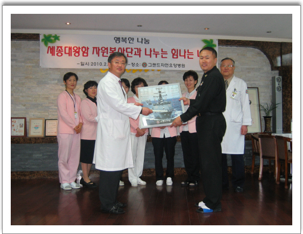지난 2.12일 세종대왕함 장병들을 대표하여 이 주임원사가 내원하여 사랑의 기금 전달식을 가졌다.세종대왕함 장병들은 지난 2.9일 본원에서 30여명의 장병들이 참여하여 자원봉사의 시간을 가진바 있다.세종대왕함 장병들은 향후 지속적으로 본원에서 봉사와 나눔을 실천하는 시간을 가질 예정이다.또 한 본원 환우중에 해군가족들과의 만남의 시간도 가졌는데 특히,본원 환우중 신갑상(76세)씨는 예비역 해군으로 대한민국 최초의 이지스함 장병들의 자원봉사하는 모습에 눈시울을 붉히기도 하였다.또 한명의 해군가족은 재활운동센터장으로 근무하고 있는 유인주 팀장의 아들로 현재 해군 신병훈련소에서 열심히 훈련중인 훈련병의 어머니라며 대한민국 최강 해군 가족임을 과시 하였다.