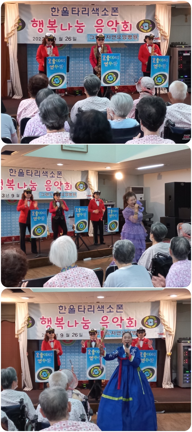그랜드자연요양병원은 9월 26일 한울타리 색소폰의 <행복 나눔>공연으로 추석맞이 공연을 열었다. 이날 공연은 달타령, 부산 갈매기 등의 색소폰 연주와 아리랑 태평가, 뱃노래 등의 민요로 어르신들과 함께 즐거운 시간을 마련했다.