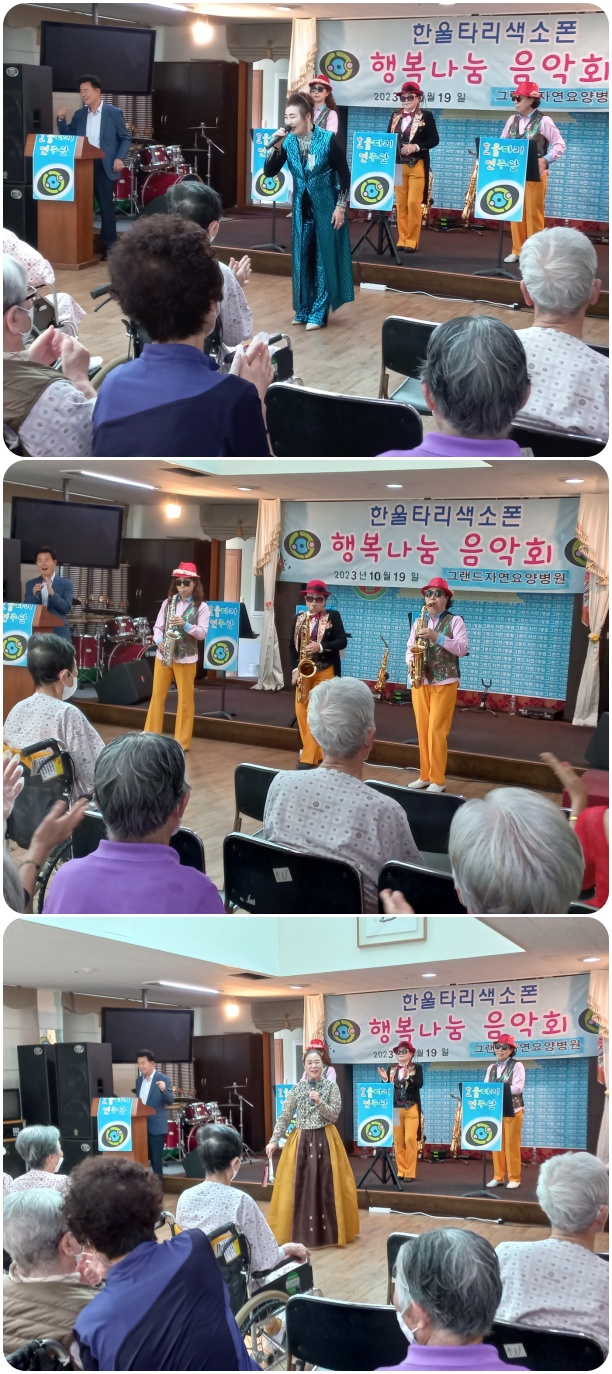 10월 19일 한울타리 연주단의 공연으로 그랜드자연요양병원 5층 이벤트홀에서 행복나눔 음악회가 열렸다. 한울타리 연주단은 <물새우는 강언덕>, <울고넘는 박달재>등 어르신들이 평소 즐겨 부르시는 옛가요와 민요를 비롯하여 색소폰 연주로 어르신들과 함께 흥겨운 시간을 마련했다.