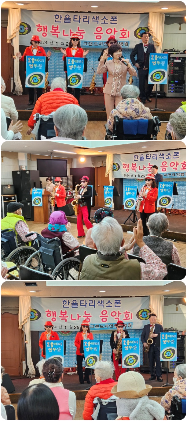 그랜드자연요양병원은 1월 25일 한울타리 색소폰의 <행복 나눔>공연으로 작은 음악회를 열었다. 이날 공연은 물새우는 강 언덕, 달타령 등의 색소폰 연주와 부초같은 인생, 해운데 엘레지 등의 옛가요로 어르신들과 함께 즐거운 시간을 마련했다.