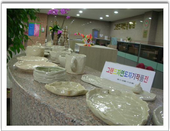 그랜드자연요양병원은 개원기념일에 즈음하여 도자기 작품전시회를 가지고 있다.이 전시회의 작품들은 지난 10.16일 본원 3F 북카페에서 환우들과 의료진들이 함게 배워본 도자기활동테라피에서 만들어진 작품들로 예암도예(범어사 입구)에서 작품에 유약을 바르고 구워져서 본원에 도착하였다.환우들이 직접 만든 작품을 만져보기도 하고 다른작품들과 비교 평가하며 즐거운 시간을 보냈다. 이 작품은 11.21일까지 전시되어지고 이후 개인들이 소장한다.