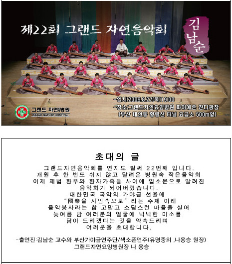 제22회 그랜드자연음악회 안내 페이지 정보 작성자 그랜드자연병원 작성일09-08-18 20:21 조회2,522회 댓글0건 이전글 다음글 목록 본문 본원은 상기와 같이 제22회 그랜드자연음악회를 연다. 이번 음악회에는 국악의 향기로 채워진다. -김대중 前대통령님의 서거를 애도합니다. *그랜드자연요양병원 가족일동* 댓글목록 등록된 댓글이 없습니다. 이전글 다음글 목록
