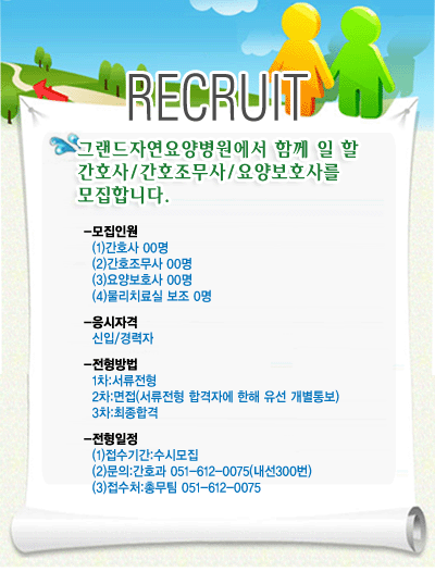채 용 공 고 ■ 간호조무사(경력) ○○ 명 ① 나이조건 : 무관 ② 근무시간 : 3교대 ※ 면허증 사본 지참, 경력자 우대 ■ 4대보험 적용 ■ 전형방법 : 1차 - 서류전형, 2차 - 면접 ■ 제출서류 : 이력서, 주민등록등본 ■ 서류접수기간 및 채용발표 : 채용시까지 (서류면접, 면접 후 개별통보) ■ 접 수 처 : 부산광역시 남구 대연동 209-1 그랜드 자연 병원 ■ 접수방법 : 방문접수, 팩스접수 ■ 전화번호 : T. 051-612-0075, FAX : 051-612-0015 ■ 채용문의 : 016-557-2446