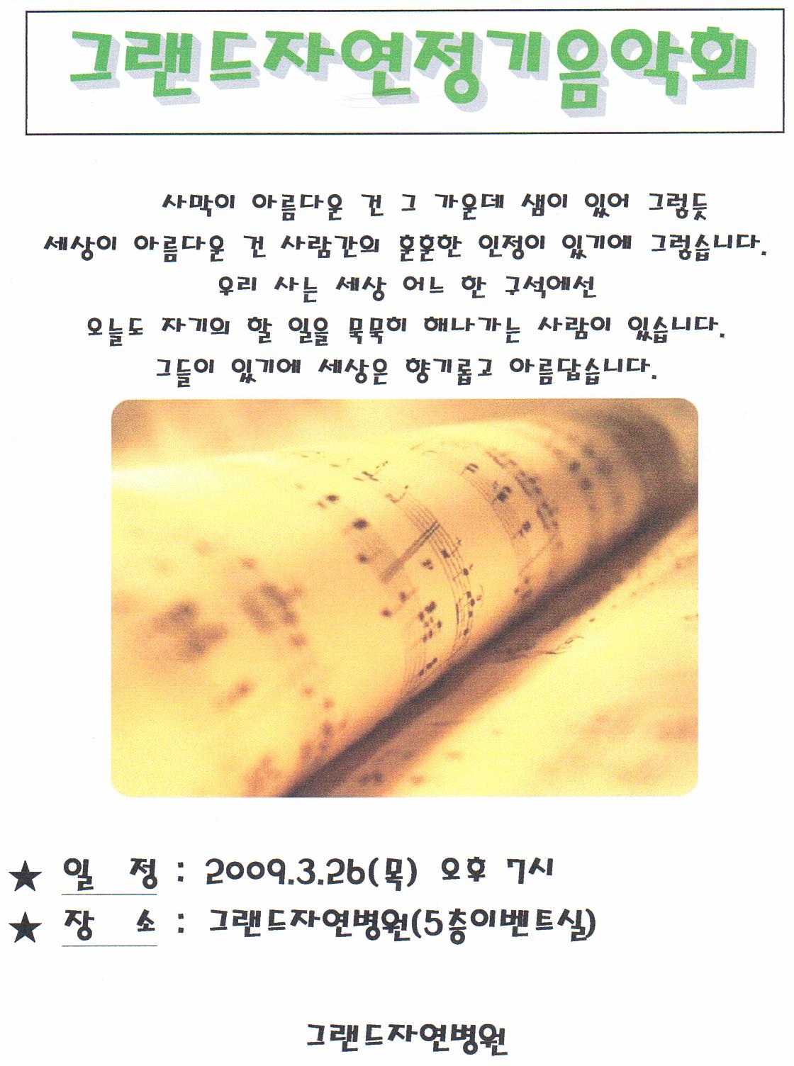 3월그랜드자연정기음악회 페이지 정보 작성자 그랜드자연병원 작성일09-03-11 12:11 조회2,371회 댓글0건 이전글 다음글 목록 본문 .. 댓글목록 등록된 댓글이 없습니다. 이전글 다음글 목록