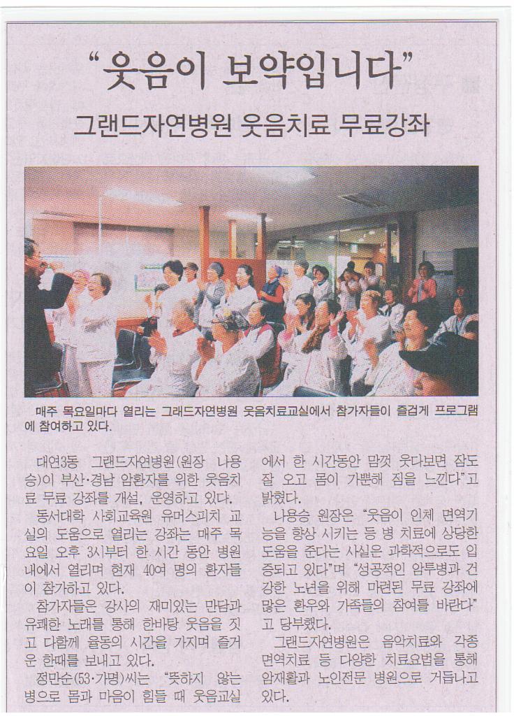 그랜드 자연병원 웃음치료 무료강좌가 신문에 실렸습니다~~~ ^^ 페이지 정보 작성자 그랜드자연병원 작성일09-03-27 15:45 조회2,427회 댓글0건 이전글 다음글 목록 본문 매주 목요일 3시에 실시하는 웃음치료가 부산남구신문에 실렸습니다 ^^ 앞으로도 많은 참석 부탁드립니다~ ♬ 댓글목록 등록된 댓글이 없습니다. 이전글 다음글 목록