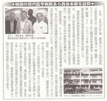 지난 4월13일 그랜드자연병원 나용승 병원장일행이 일본 동경에 위치한 니시본부를 방문하여 상호 협력체제를 구축하기 니시 본부장과 니시측에서 준비한 3박4일의 바쁜 일정을 소화하였다.니시측에서는 “니시건강법 2009년 5월호”에 한국의 그랜드자연요양병원측 일행의 방문소식을 전했다. [전문] 4월13일 오후 한국의 그랜드자연요양병원(부산소재) 나용승 병원장과 한국자연건강회 배성권 前회장 일행이 동경에 위치한 니시본부사무소를 방문하였다. 나원장이 있는 그랜드자연요양병원은 150여 베드를 가지고 있으며 부산에서 잘 알려진 노인요양병원이다.나원장은 노인의학전문의 과정을 수료하였으며 바쁜 와중에도 현재,부산의과대학 외래교수로도 근무중이다. 배前회장도 니시건강법 강좌를 개설하여 활발히 활동중이다.나원장이 있는 그랜드자연요양병원에서도 현대의학에 니시건강법을 적용하여 환자를 치유하고 있다.니시건강법을 환자식과 진료 치료에 도입을 목적으로 와타나베병원(일본 동경)일일 체험을 통해 최신 니시건강법의 정보교환을 위해 니시본부를 방문,배전회장의 통역으로 본부장과 회담하였다. -The Nishi Health System