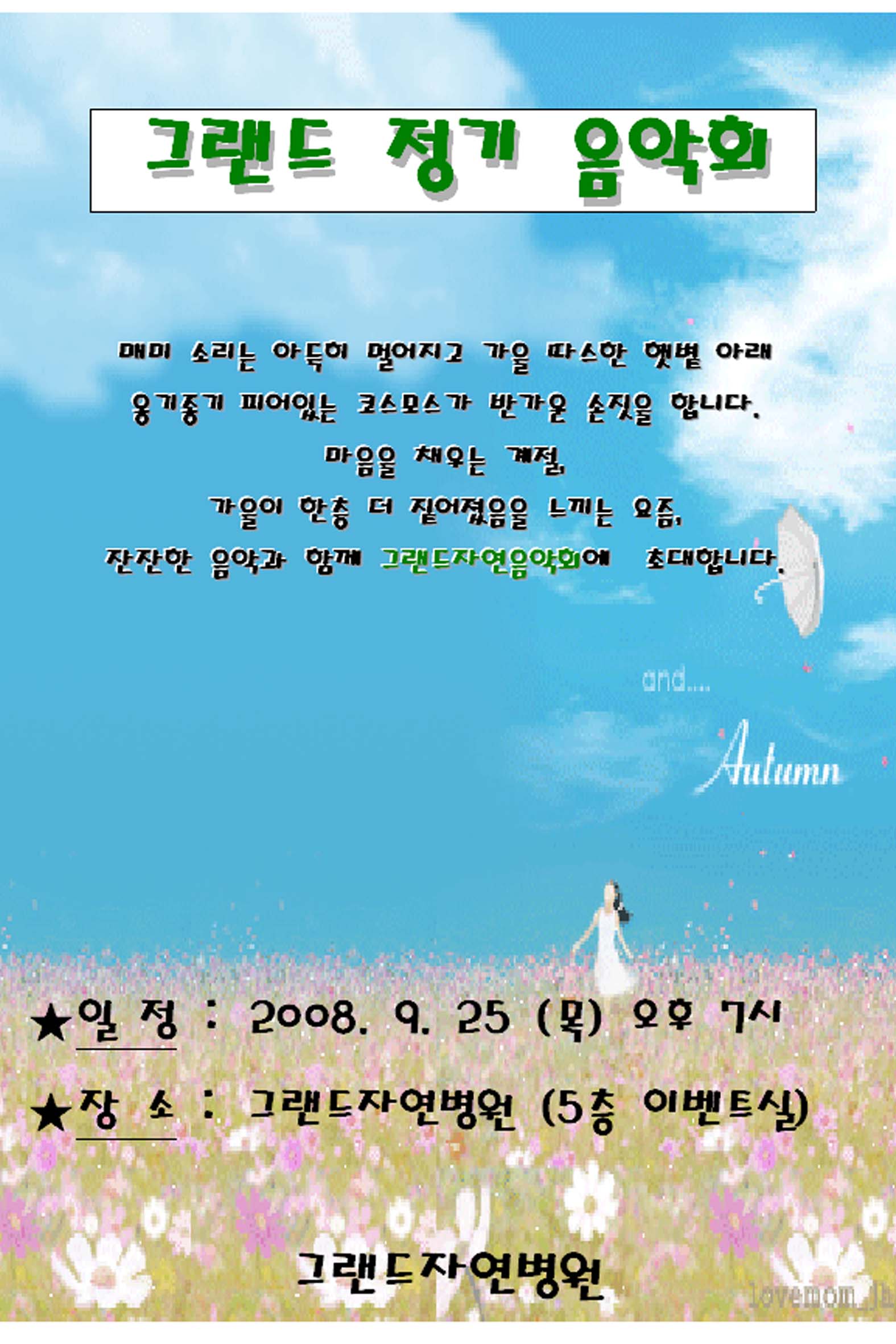 9월 그랜드자연정기음악회 페이지 정보 작성자 그랜드자연병원 작성일08-09-19 20:34 조회2,439회 댓글0건 이전글 다음글 목록 본문 .. 많은 참석 부탁드립니다^^ 댓글목록 등록된 댓글이 없습니다. 이전글 다음글 목록