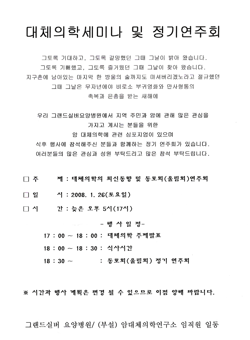 건강강연회 및 정기연주회 페이지 정보 작성자 그랜드자연요양병원 작성일08-01-12 10:45 조회2,875회 댓글0건 이전글 다음글 목록 본문 많이 많이 참석해주세요..^^ 댓글목록 등록된 댓글이 없습니다. 이전글 다음글 목록