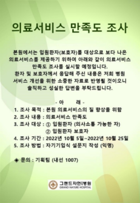 의료서비스 만족도 조사(2022년10월5일~10월25일) 페이지 정보 작성자 최고관리자 작성일22-09-26 10:41 조회912회 댓글0건 이전글 다음글 목록 본문 의료서비스 만족도 조사 댓글목록 등록된 댓글이 없습니다. 이전글 다음글 목록