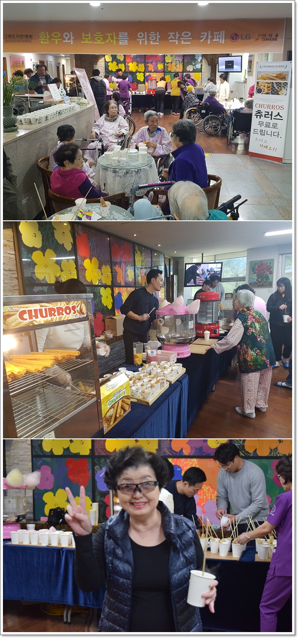 <LG아워홈과 함께하는 작은 카페> 열어 페이지 정보 작성자 최고관리자 작성일19-12-04 15:54 조회1,179회 댓글0건 이전글 다음글 목록 본문 11월 16일 그랜드자연요양병원은 개원 12주년을 맞이하여 1층 로비에서 보호자분들과 어르신들을 위한 <LG아워홈과 함께하는 작은 카페>를 열었다. 츄러스, 팝콘, 오뎅, 호빵, 커피 등을 무상으로 제공하였으며 어르신들은 가족과 함께 즐거운 추억을 만드는 시간이 되었다. 댓글목록 등록된 댓글이 없습니다. 이전글 다음글 목록