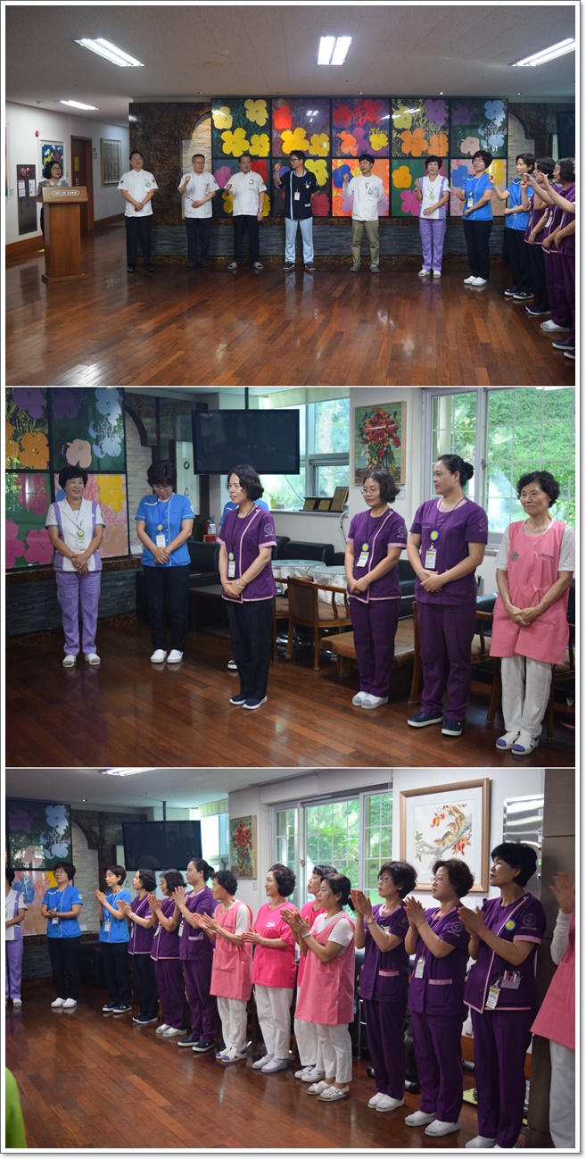 그랜드자연요양병원은 8월 1일 1층 로비에서 전직원들이 참석한 가운데 그랜드자연 월례회를 가졌다. 이재일 병원장은 날씨가 더워짐에 있어 어르신들의 건강관리에 더 각별한 주의를 당부하였으며. 이어서 신입직원들의 인사가 이어졌고 8월의 다짐과 함께 구호를 외치며 8월 월례회를 마쳤다.