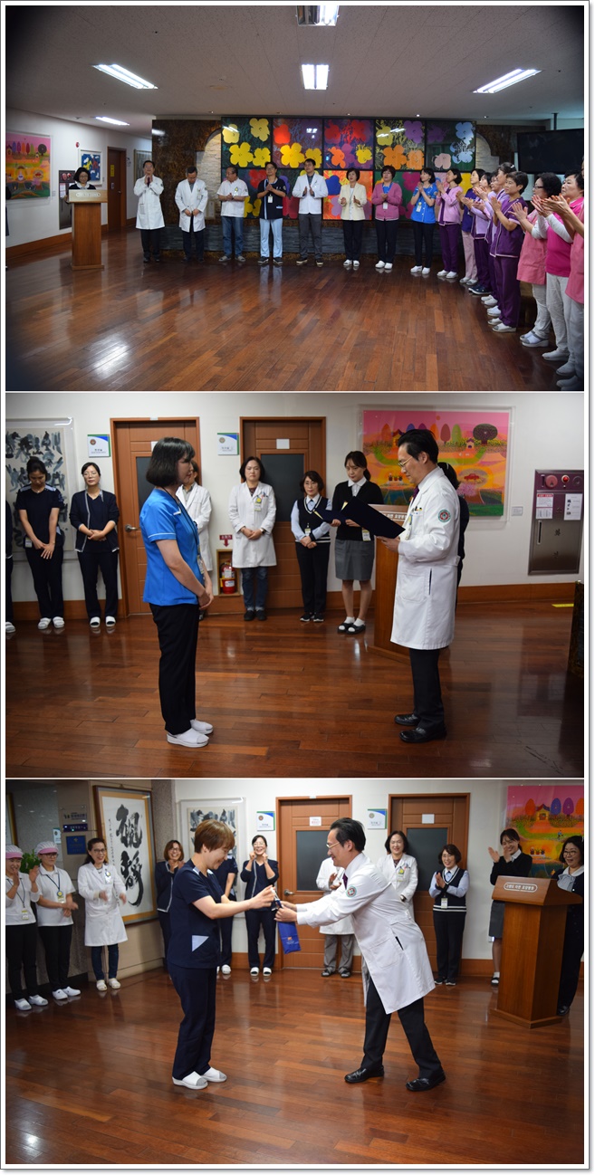11월 1일 그랜드자연요양병원은 1층 로비에서 전직원들이 참석한 가운데 그랜드자연 11월 월례회를 가졌다. 이재일원장은 11월을 맞은 그랜드자연 가족 여러분들 모두에게 올 한해 좋은 결실들이 맺어질 수 있게 다시 한 번 점검하는 계절로 거듭나기를 강조하였다. 이어서 신입직원들의 인사가 이어졌고, QPS위원회 위원과 감염위원회 위원의 새로이 임명되는 위원들에 대한 임명장을 수여하였다. 또한 수능 자녀를 둔 직원들을 격려하며 수능 대박을 기원하는 마음을 모아 준비한 쵸콜렛을 전달하였다. 따뜻함이 넘치는 11월 월례회를 전직원들은 11월을 준비하는 마음으로 병원 구호를 끝으로 월례회를 마쳤다.