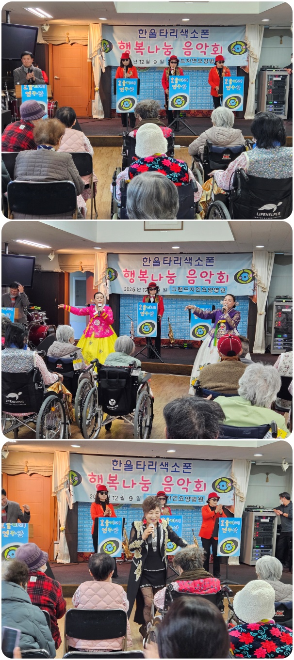 12월 9일 한울타리 연주단의 공연으로 그랜드자연요양병원 5층 이벤트홀에서 작은음악회가 열렸다. 한울타리 연주단은 <물새 우는 강 언덕>, <진도 아리랑>등 어르신들이 평소 즐겨 부르시는 옛가요와 민요를 비롯하여 색소폰 연주로 어르신들과 함께 흥겨운 시간을 마련했다.
