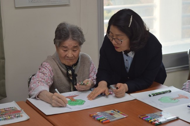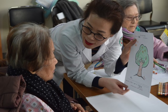 그랜드자연요양병원에서 활용하고 있는 어르신들을 위한 인지재활 특화프로그램 중 미술요법은 그림으로 어르신들의 마음을 읽는다. <나의 나무 꾸미기>는 무의식 자아에서 시간적 범위를 인식하며 자아 존중감 향상에 도움을 준다.