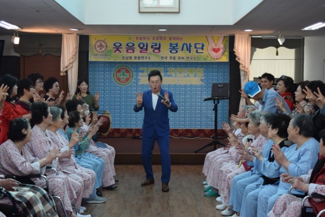 그랜드자연요양병원은 우리 어르신들이 보다 나은 병상생활을 통해 건강해지기 위한 특화 프로그램으로 웃음박사 조상영 교수를 모셔 즐거운 웃음요법을 하고 있다.