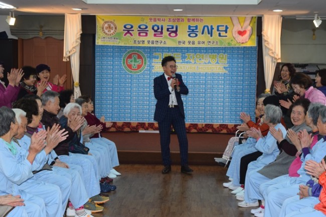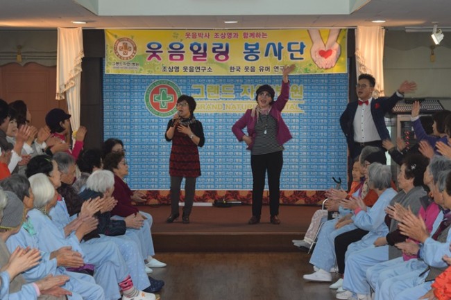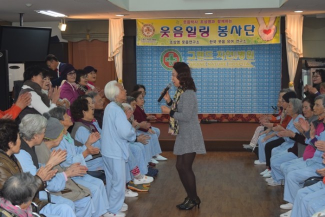 그랜드자연요양병원은 우리 어르신들이 보다 나은 병상생활을 통해 건강해지기 위한 문화 프로그램으로 웃음박사 조상영 교수를 모셔 즐거운 웃음치료를 하고 있다.