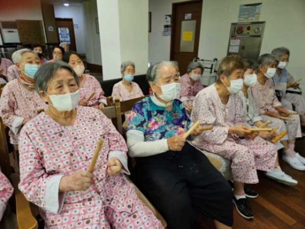 그랜드자연요양병원의 다양한 음악요법 프로그램 중 어르신들이 선호하는 음악활동은 노래부르기(기억 속에 잔존하고 있는 노래를 생각나게 하고 가사를 통해 문자의 기억을 되살려 언어능력의 회복을 기대할 수 있다)이다.