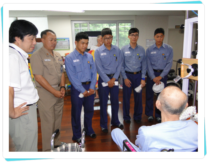 해군장병들이 본원에 입원중인 예비역 해군 신갑상(해군 중사로 전역) 어르신을 찾아가서 위문을 하는 모습입니다.신갑상 어르신은 본원을 찾은 세종대왕함 장병들과 옛추억에 잠시나마 젖어들었습니다.