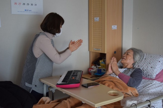 그랜드자연요양병원은 어르신들을 대상으로 <치료적 노래만들기와 부르기> <악기 연주하기> <음악 회상하기> <움직이기/ 춤추기> <음악 감상하기> 등 음악의 사용으로 삶의 질을 향상시키고, 음악요법 활동에 참여함으로 상호작용과 사회적 의사소통의 참여도를 높이며 긍정적 경험을 통하여 심리적 안정을 얻고자 한다.