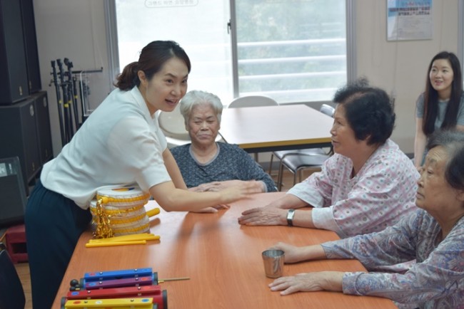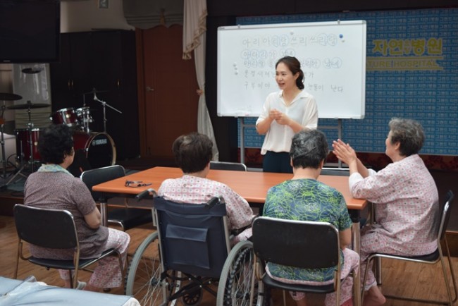 그랜드자연요양병원은 어르신들을 대상으로 <치료적 노래만들기와 부르기> <악기 연주하기> <음악 회상하기> <움직이기/ 춤추기> <음악 감상하기> 등 음악의 사용으로 삶의 질을 향상시키고, 음악요법 활동에 참여함으로 상호작용과 사회적 의사소통의 참여도를 높이며 긍정적 경험을 통하여 심리적 안정을 얻고자 한다.